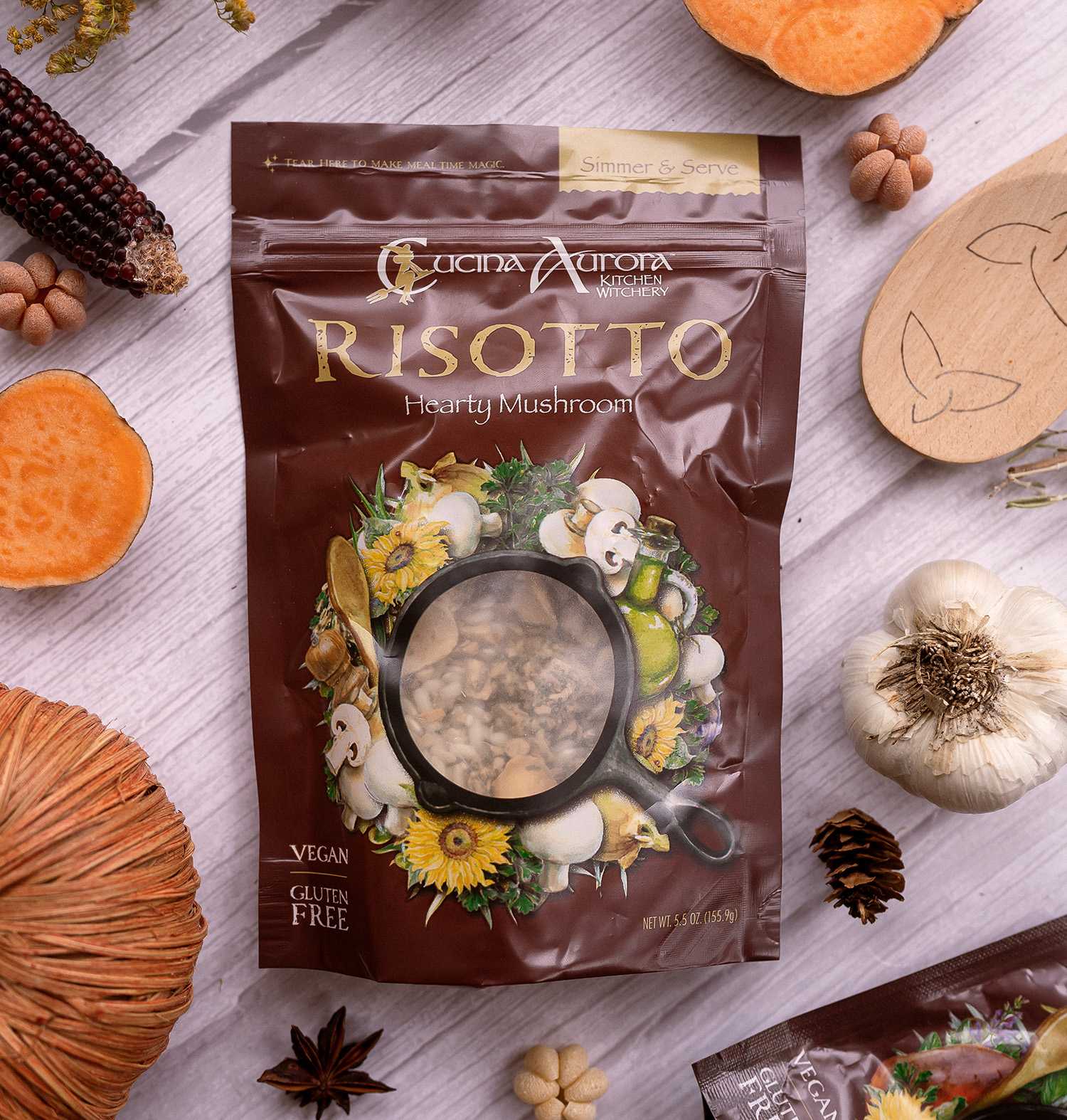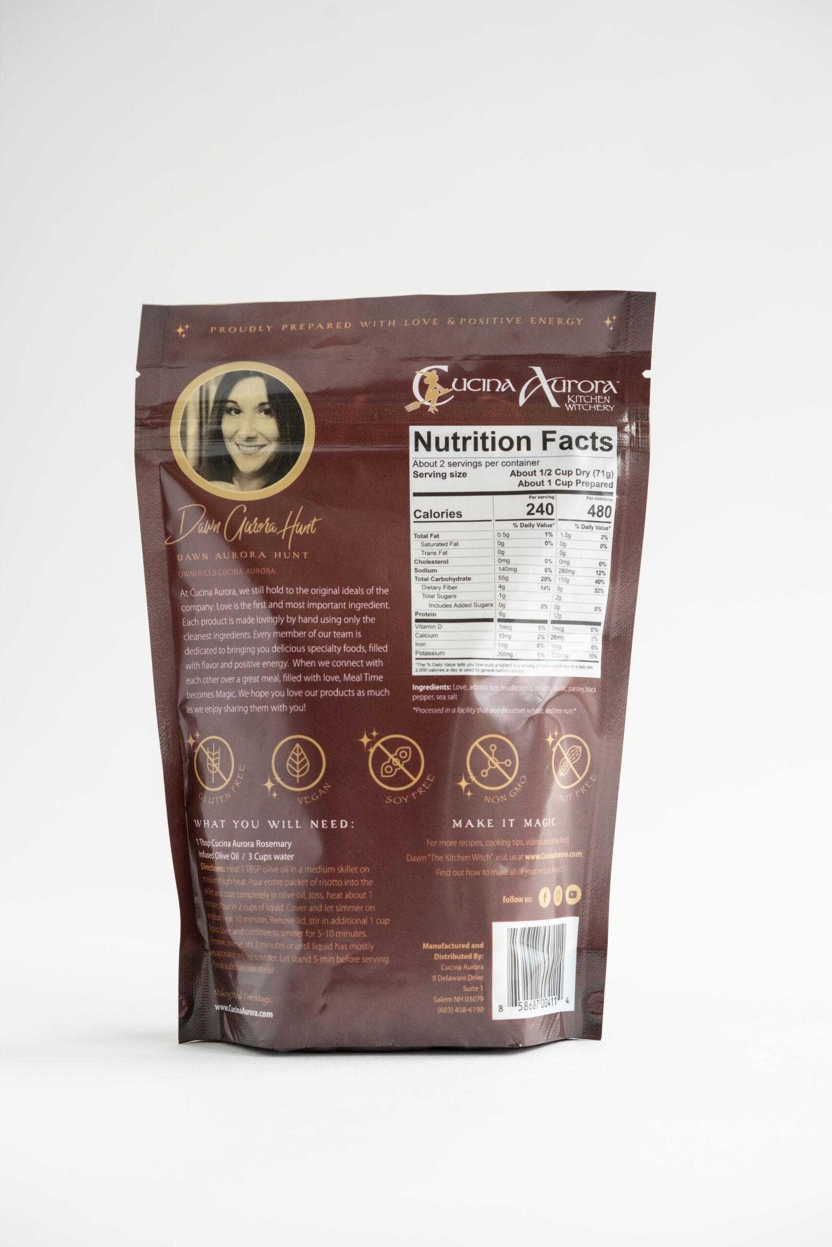 Creamy and flavorful, our Risotto mixes are perfect for cooking up something special in just 20 minutes. We use only Arborio rice, native to Italy. Risotto is generally thought to be time consuming and hard to cook. But the Kitchen Witch has made it easy! Simmer, stir and serve! 5.5 oz package makes 2 cups cooked risotto.